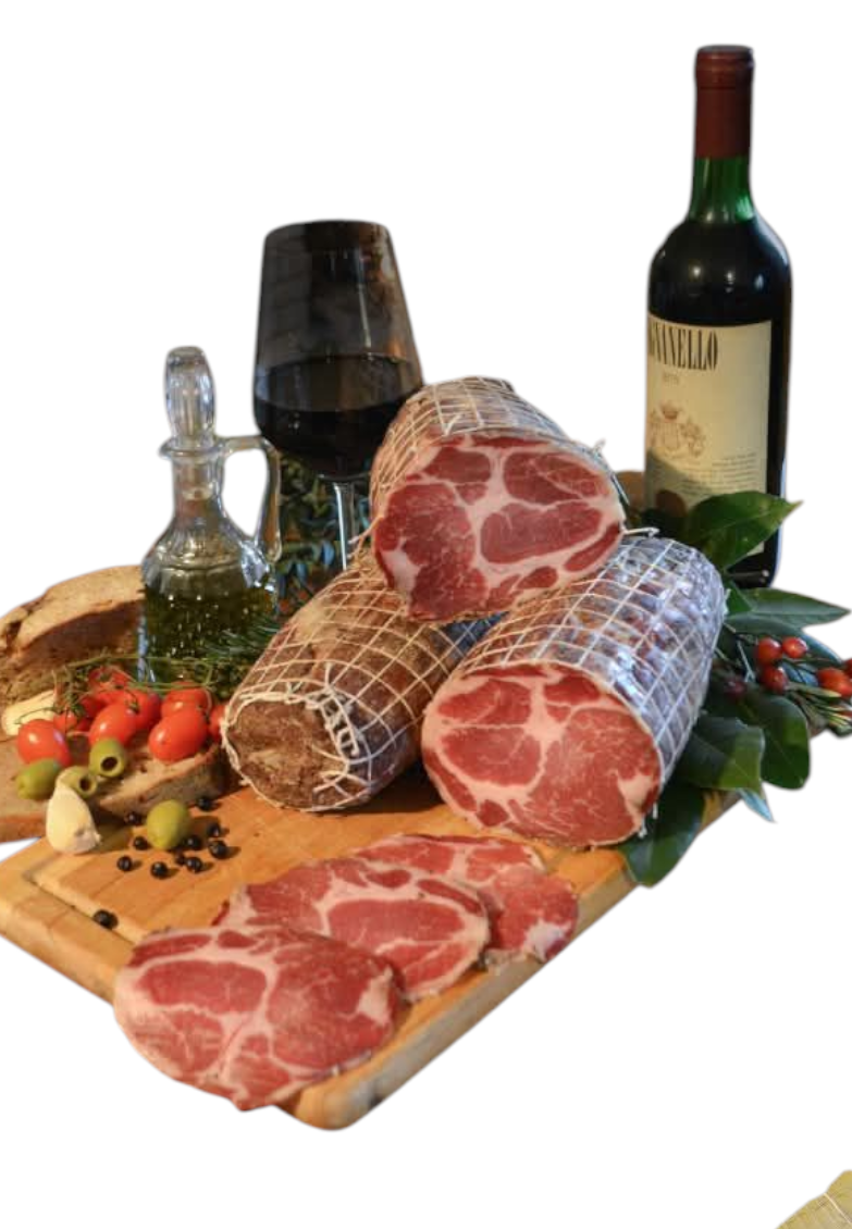 Il capocollo umbro è un salume tipico della tradizione norcina, ottenuto da selezionate carni suine lavorate artigianalmente e insaporite con un sapiente equilibrio di sale, pepe e aromi naturali. Dopo una lenta stagionatura, il prodotto sviluppa un gusto intenso ma equilibrato, con una consistenza morbida e leggermente marezzata.