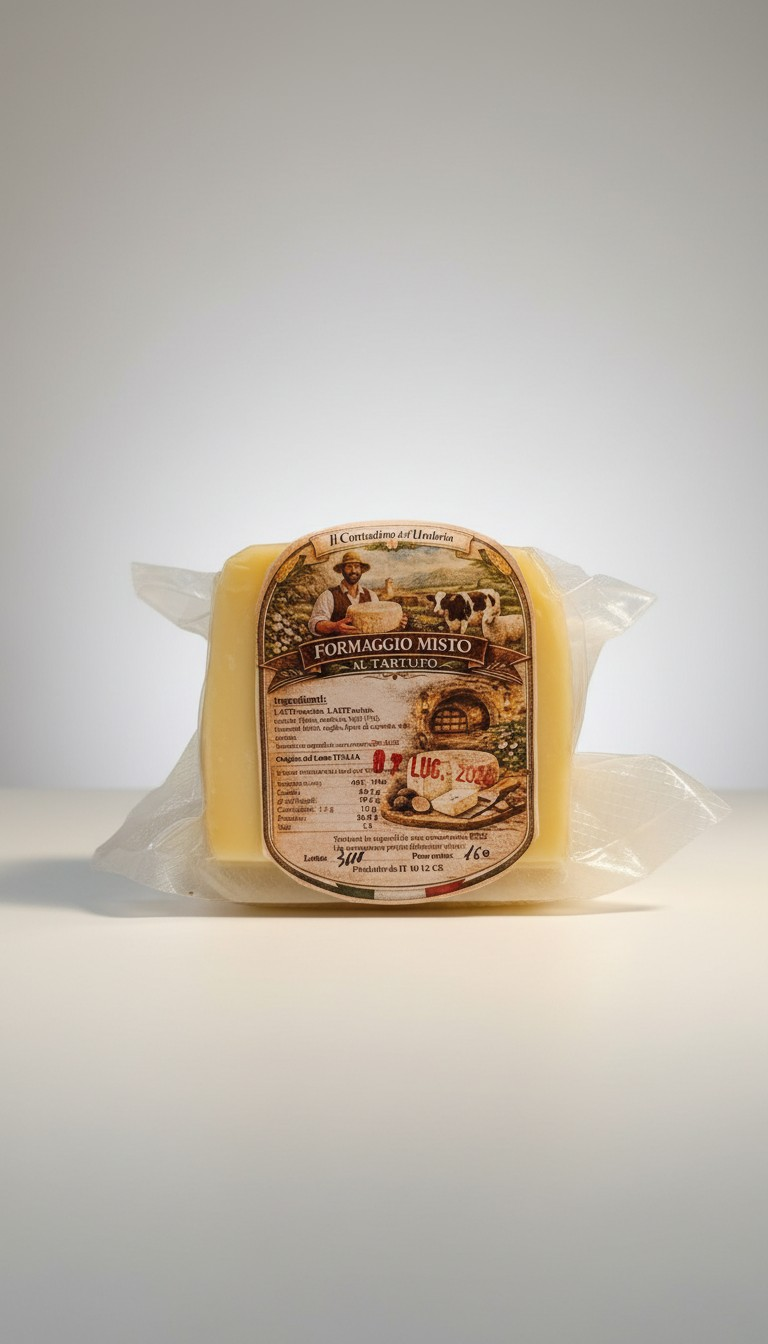 Realizzato con latte misto vaccino e ovino, questo formaggio viene arricchito con scaglie di tartufo, che donano un profumo intenso e inconfondibile. La lavorazione artigianale e la stagionatura permettono di ottenere una pasta compatta e armoniosa, capace di esaltare al meglio le note aromatiche del tartufo senza coprire la delicatezza del latte.